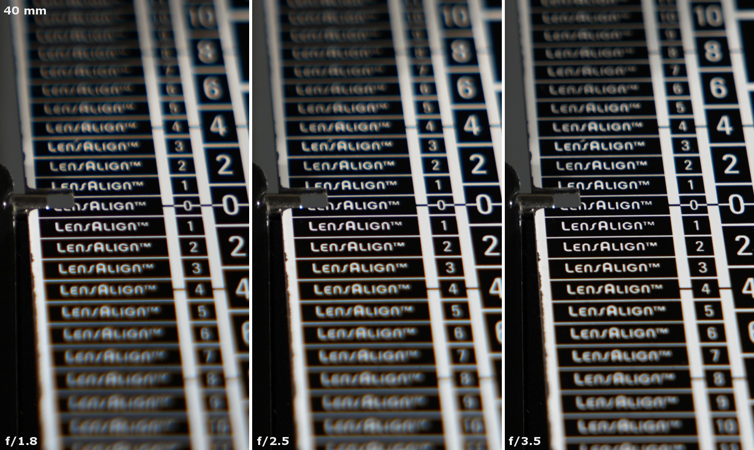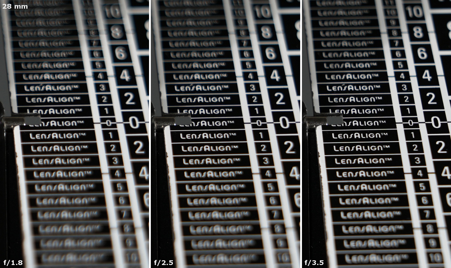 Spherical aberration we assess in three different ways. Firstly, we check the resolution of the lens and whether you notice characteristic 'mist' in the area close to the maximum relative aperture, as such mist is connected to undercorrection of this aberration. Secondly, we look for any traces of focus shift effect. Thirdly, we compare the appearance of defocused circles of light produced before and behind the focus.In case of the tested Sigma only the third of these tests showed a slight trace of spherical aberration. Circles we got before and behind the focus, both at 28 and 40 mm, differ from each other – from one side we got a soft edge, from the other a brighter rim. What's interesting, the change of focal length makes this rim change its position.