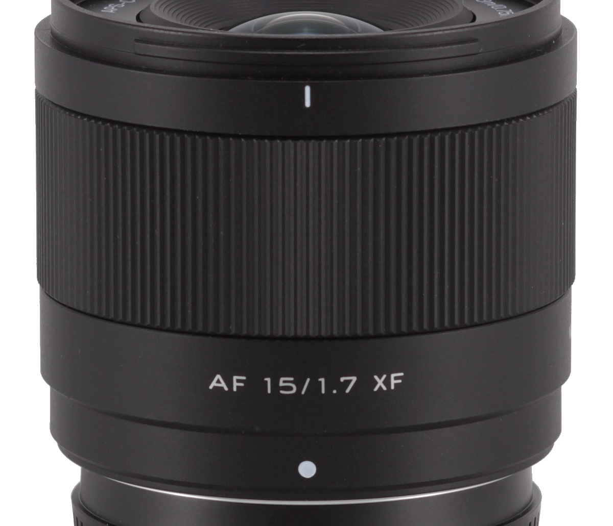 The proper body of the lens is covered by black plastics. It starts with an immobile ring with a white dot that makes an alignment with a camera easier, the logo of the company, a model number, a serial number, and information about the place of production, China. Then the ring increases its diameter and on the already enlargened part you find another producer's logo, and an inscription 'AF 15/1.7 XF'.