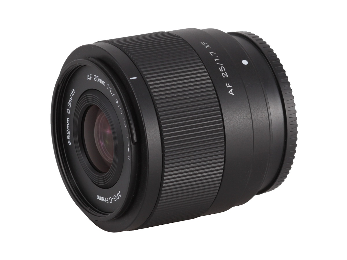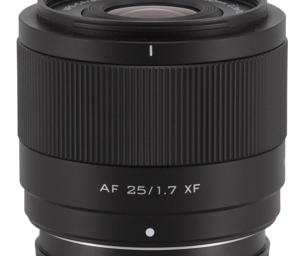 The proper body of the lens is covered by black plastics. It starts with an immobile ring with a white dot that makes an alignment with a camera easier, the logo of the company, a model number, a serial number, and information about the place of production, China. Then the ring increases its diameter and on the already enlargened part you find another producer's logo, and an inscription 'AF 25/1.7 XF'.