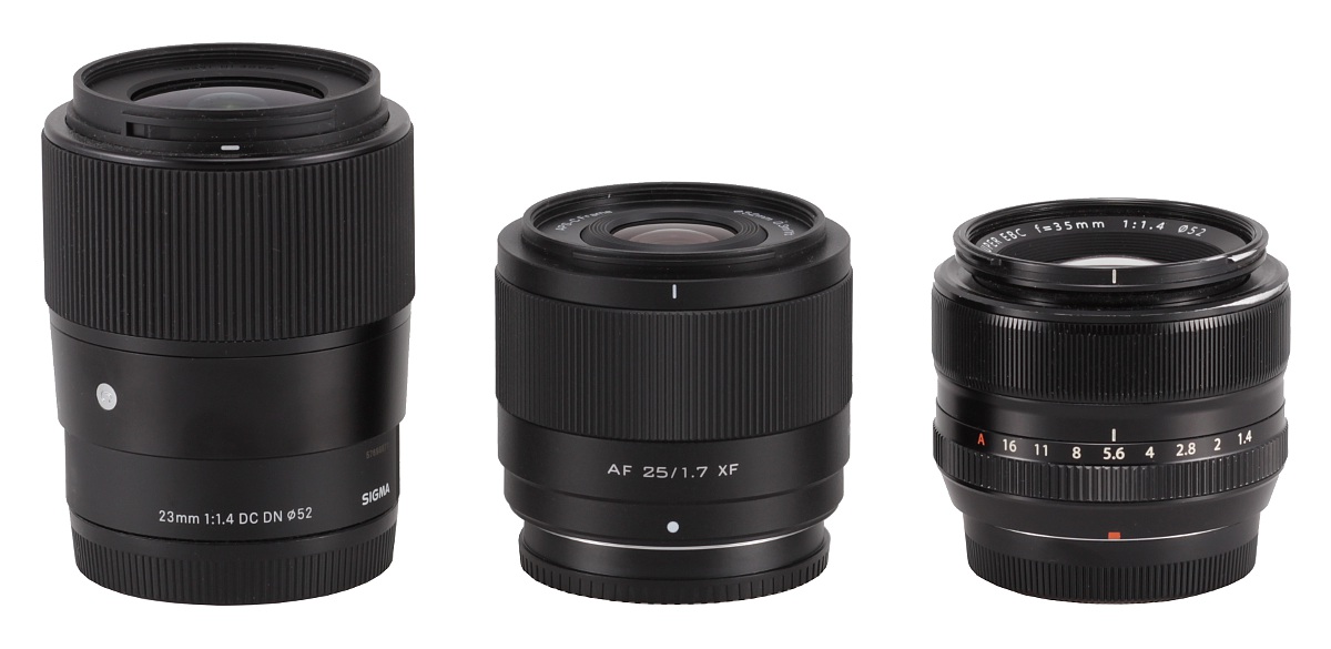 In the photo below the tested lens is positioned between the faster Sigma C 23 mm f/1.4 DC DN and a faster X system standard lens, the Fujinon XF 35 mm f/1.4 R.