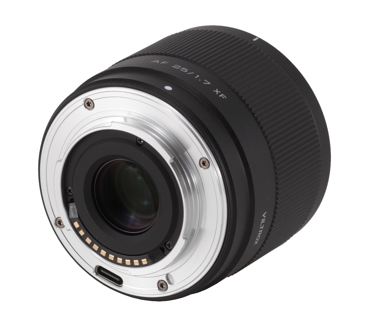 The Viltrox AF 25 mm f/1.7 Air starts with a metal mount which rim features an USB-C port that allows you to join the lens to a computer and install the right software. Inside the mount you can find a black ring with embedded contacts that surround a rear element of the lens, 19 mm in diameter. This element doesn't move and is positioned practically on the same level as the contacts. From this side everything looks very well.