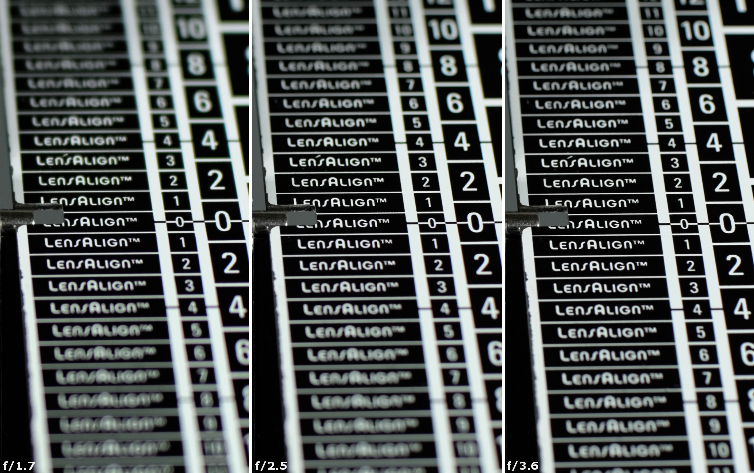 In first photos of this chapter you can notice slight focus shift. During stopping down of the aperture the depth of field shifts slightly toward greater distances.Effect of a similar scale you can observe in defocused circles of light reached before and behind the focus. A slight influence of spherical aberration is noticeable in a shape of a soft edge in the first circle and a slightly brighter rim of the second one.