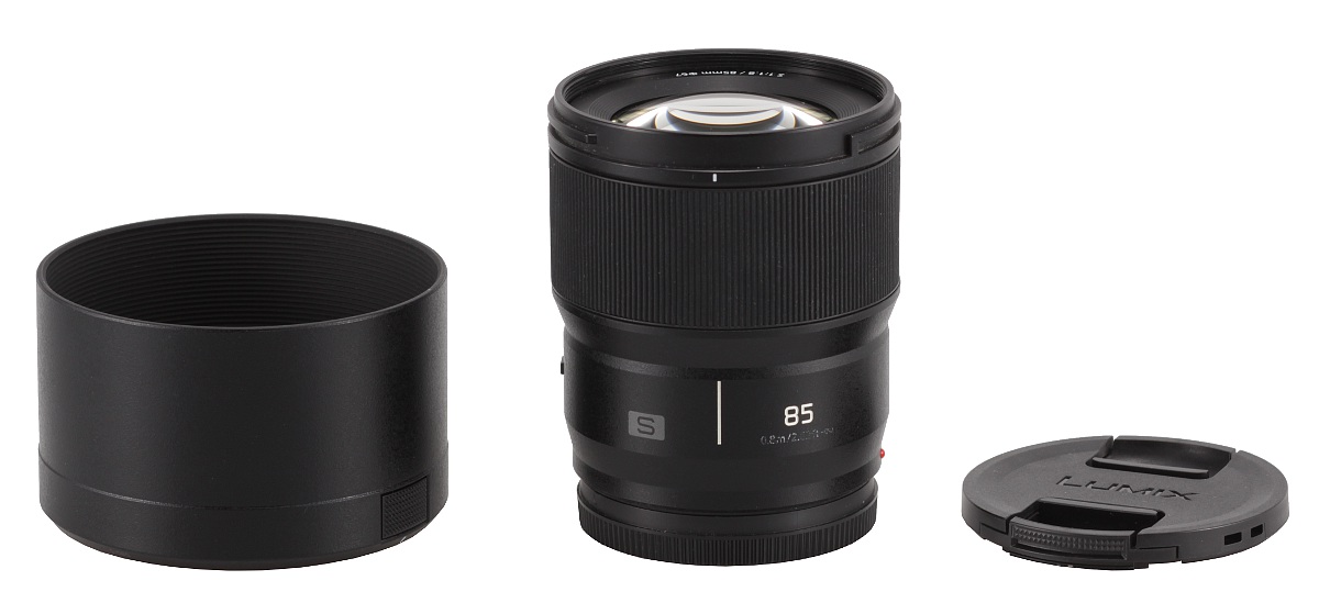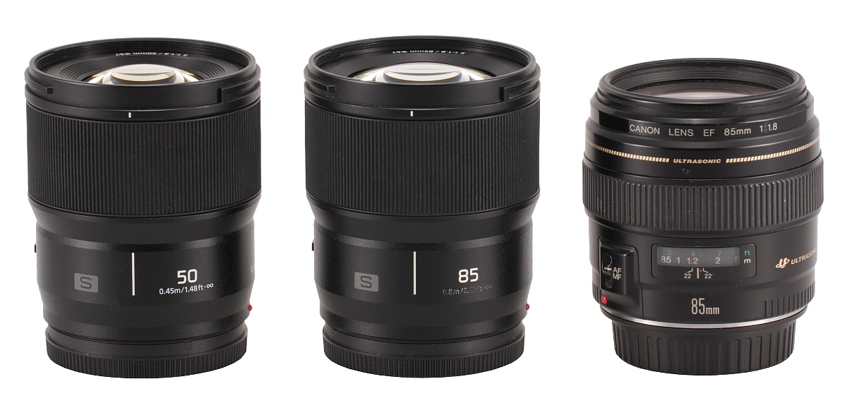 In the photo below the Panasonic S 85 mm f/1.8 is positioned between its system cousin, the Panasonic S 50 mm f/1.8 and the reflex camera Canon EF 85 mm f/1.8 USM.