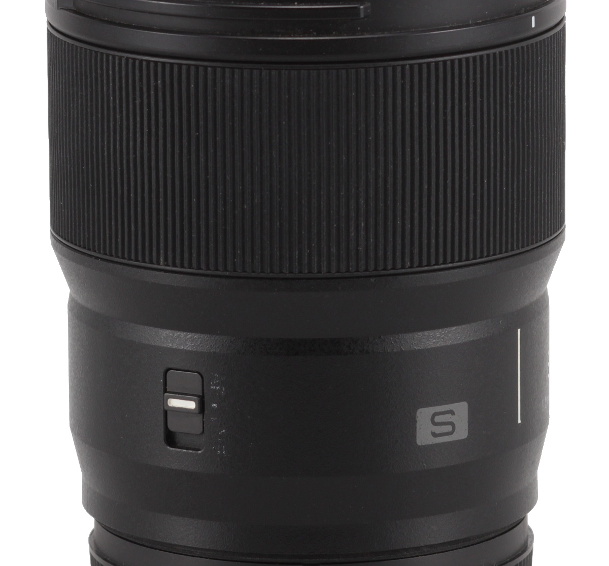 The proper body of the lens is covered by black plastics. First, you see a red dot, making an alignment with a camera easier. Then, looking from the above, you find a white vertical line – on its left side there is a capital 'S' and on the right the focal length marking '85' and the focusing range, '0.8m/2.62ft-∞'.