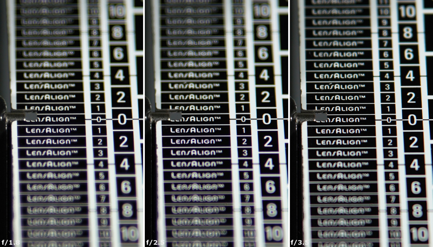 In phirst photos of this chapter you can notice a focus shift effect but it is a tad specific. While passing from f/1.8 to f/2.5 you don't notice anything worrisome, only stopping down fromf/2.5 to f/3.5 shows a slight shift of depth of field toward greater distances. This performance explains why the Samyang was able to defeat its rivals at the maximum relative aperture and then it lost its advantage on stopping down the aperture to near f/2.8.Slight influence of spherical aberration remains visible also in the light spread of out-of-focus circles we reached before and behind the focus. Both circles show a slightly accented rim but in the case of the second one it is far brighter.