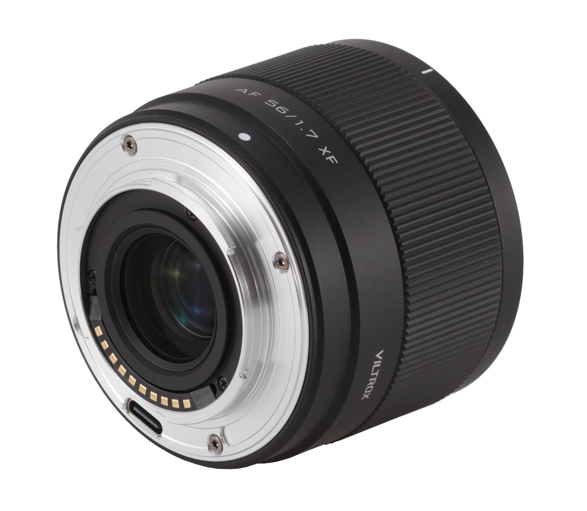 The Viltrox AF 56 mm f/1.7 Air starts with a metal mount which rim features an USB-C port that allows you to join the lens to a computer and install software updates. Inside the mount you can find a black ring with embedded contacts that surrounds a rear element of the lens, 22 mm in diameter. This element doesn't move and is positioned practically on the same level as the contacts. From this side everything looks very well.