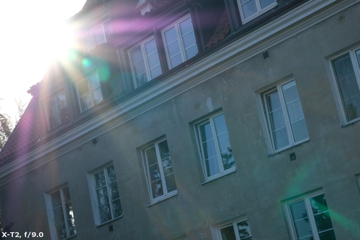 The situation is especially weak when the source of bright light is positioned right outside the frame. With the aperture stopped down in a significant way the frame corner can get overexposed by a very bright flare that turns into a big, distinct arc as you move it further from the sun.