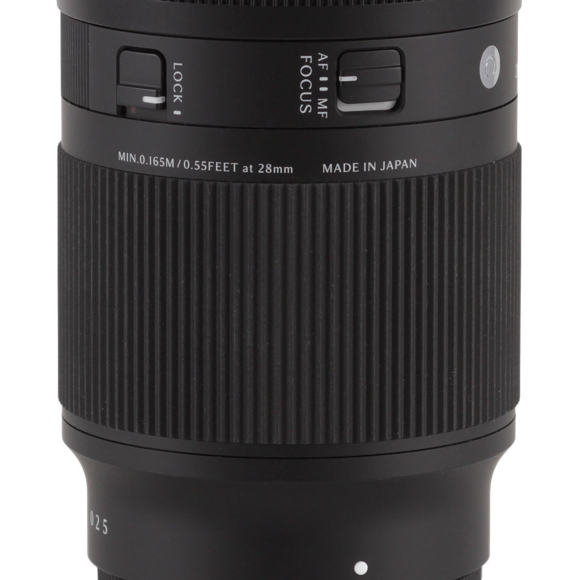 An immobile part of the casing, partially covered by fine ribbing, is next; it features the name and parameters of the lens, the logo of the producer, the serial number, a silver C letter meaning the lens belongs to the Contemporary line, and also two switches. The first one, AF/MF, controls the focus ring modes, and the second one, LOCK, blocks the zoom ring at 20 mm in order to prevent an uncontrollable change of dimensions of the lens.