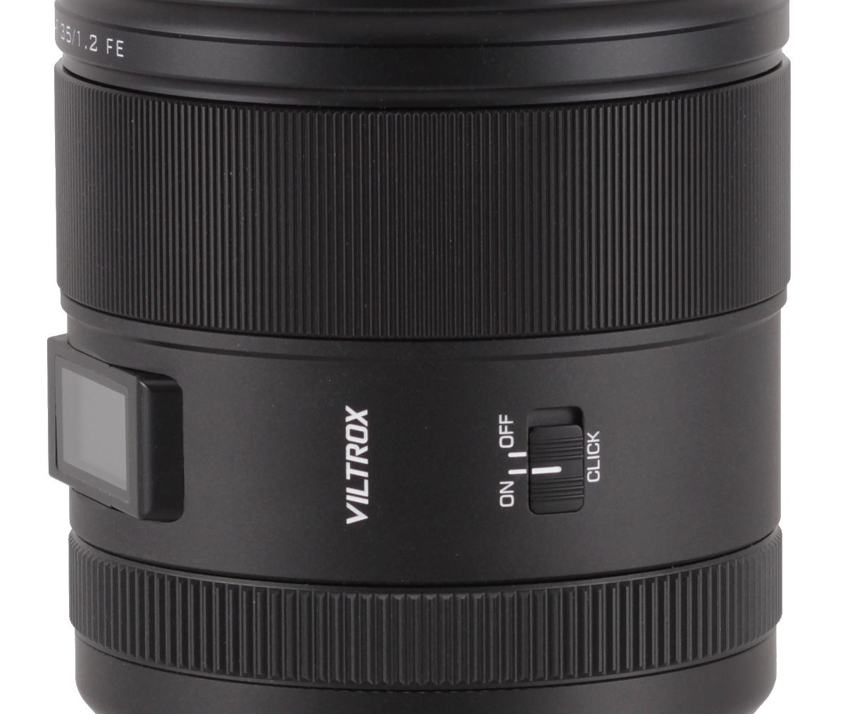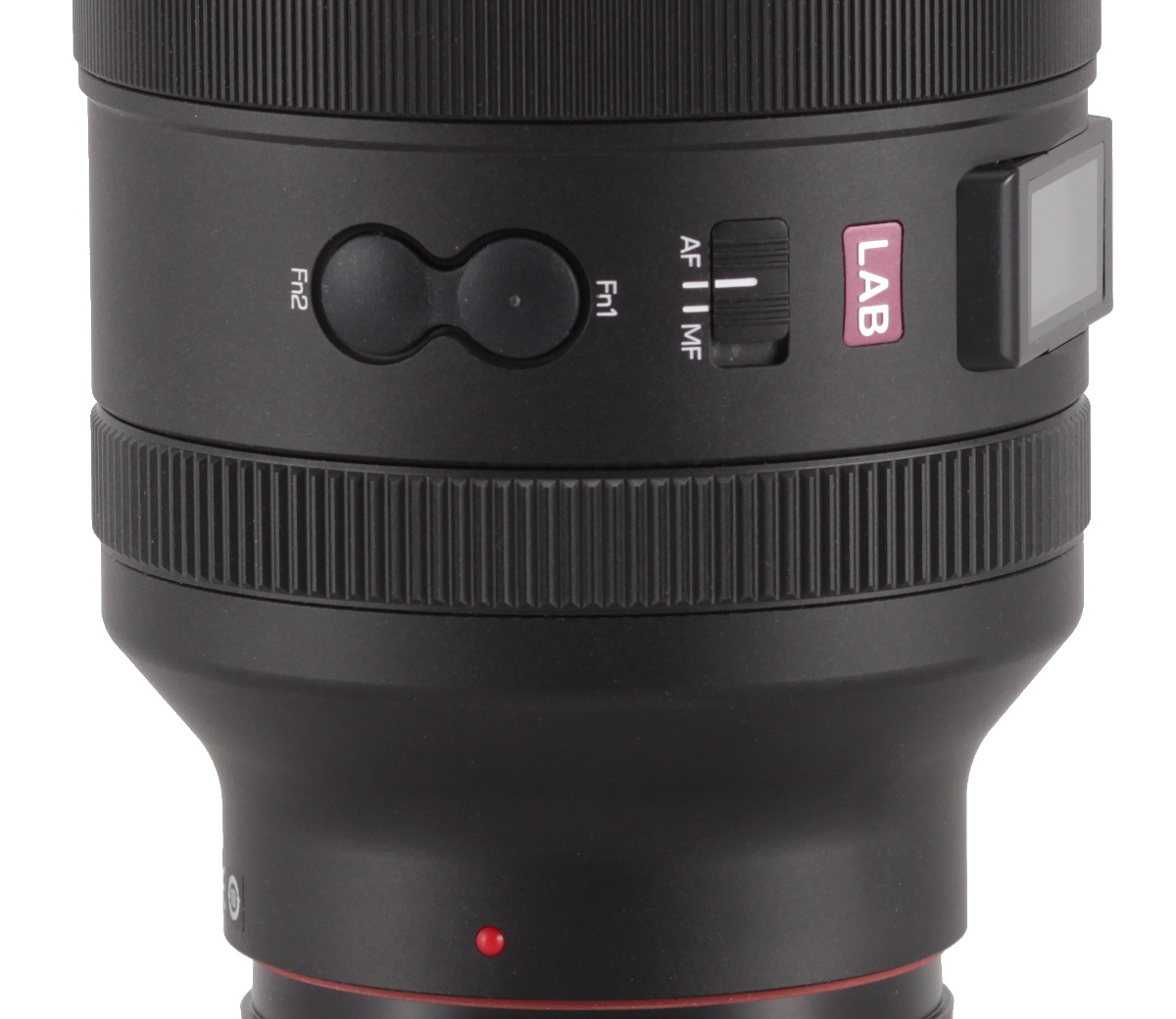 Looking from above, on the left side of the LCD, you find a red series mark (LAB), the AF/MF switch, and two programmable function buttons Fn1 and Fn2. On the other side of the display, you see the logo of the producer and the CLICK ON/OFF switch that allows you to change the aperture ring working mode.