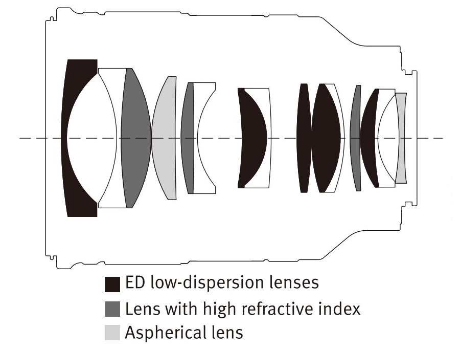 When it comes to the optical coconstruction, you deal here with 15 elements positioned in 10 groups. Among them you can find as many as five elements made of low dispersion ED glass, three elements made of high refraction index glass (HR) and two aspherical ones. The producers weren't skimpy when it comes to special elements. Inside you can find a round aperture with 11 diaphragm blades that can be closed down to a value of f/16 at the maximum.