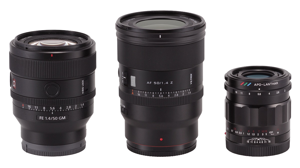 In the photo below the Viltrox AF 50 mm f/1.4 Pro is positioned between the Sony FE 50 mm f/1.4 GM and the Voigtlander Apo Lanthar 2/50. It's worth comparing the Viltrox to the Sony because these two are direct rivals.