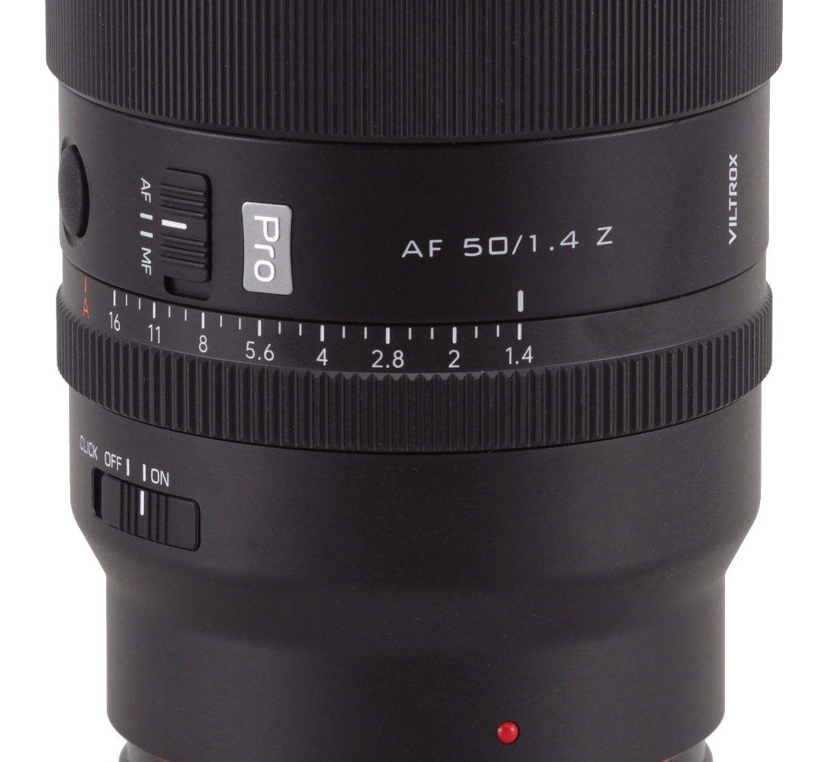 A black ring made of metal that increases its diameter is the first part of the proper barrel of the Viltrox 1.4/50. On this ring you can find a red dot, making an alignment with a camera easier, a serial number, information about the place of production, China this time, and the CLICK ON/OFF switch that is used to change the aperture ring mode from clicked to declicked.