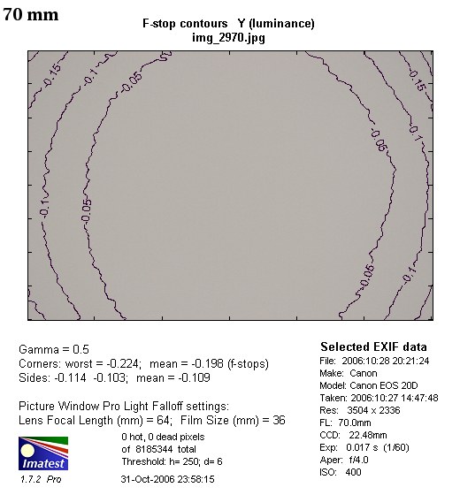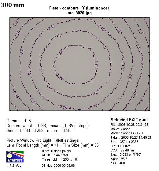 where for f/5.6 the vignetting reaches 11% and for f/8 drops to 4%.