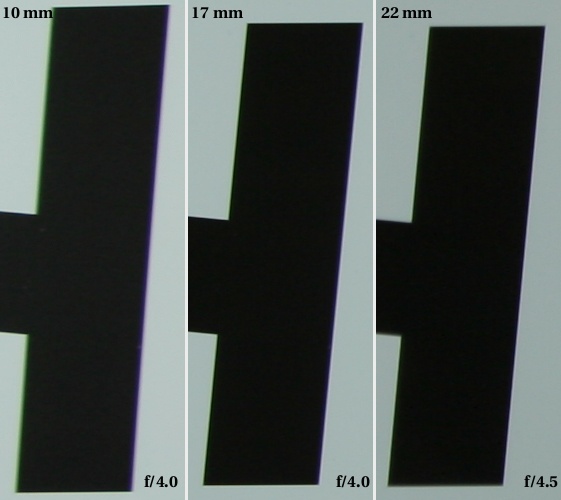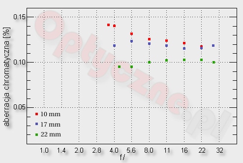 The chromatic aberration is clear, the biggest for a wide angle and at an acceptable level for 22 mm. Only for 10 mm and when stopping down the lens, does the aberration seem to decrease. For other focal lengths, chromatic aberration does not depend on the aperture used.