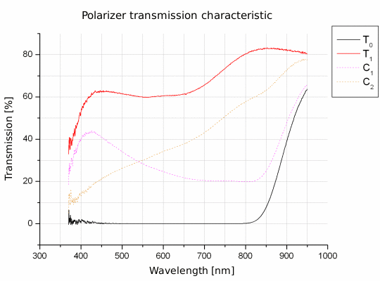 9th place in the overall ranking (26.3/37.5)The transmission curve is flat up to 700 nm, at the end of the visible spectrum the transmission’s increase reaches 10%. The extinction coefficient of about 2/10000 is very good for a foil polarizer. C1 and C2 graphs indicate that we’re dealing with a quarter-wave plate of zeroth order designed for the middle of visible spectrum. Perhaps the HMC layers protect well against scratches (not tested), but they’re not excellent at flares’ reduction. It’s difficult to determine the influence of the streaks on resolution, it would require thorough tests.