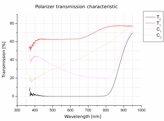 16th place in the overall ranking (22.4/37.5)The transmission is constant in the majority of visible spectrum, decreases slightly for short waves section and rises by 10% for long-wave end of visibility. Violet color is not extinguished entirely, but it’s not a considerable problem. The polarizer becomes transparent in infrared. The extinction coefficient of about 4.5/10000 is a good result for a foil polarizer. C1 and C2 graphs indicate that we’re dealing with a quarter-wave plate of zeroth order designed for the middle of visible spectrum, with a slight shift towards shorter waves. The filter doesn’t impress by its optical quality. Visible flares, scattering and streakiness don’t look well compared to competitors. For 399 PLN you could expect more.